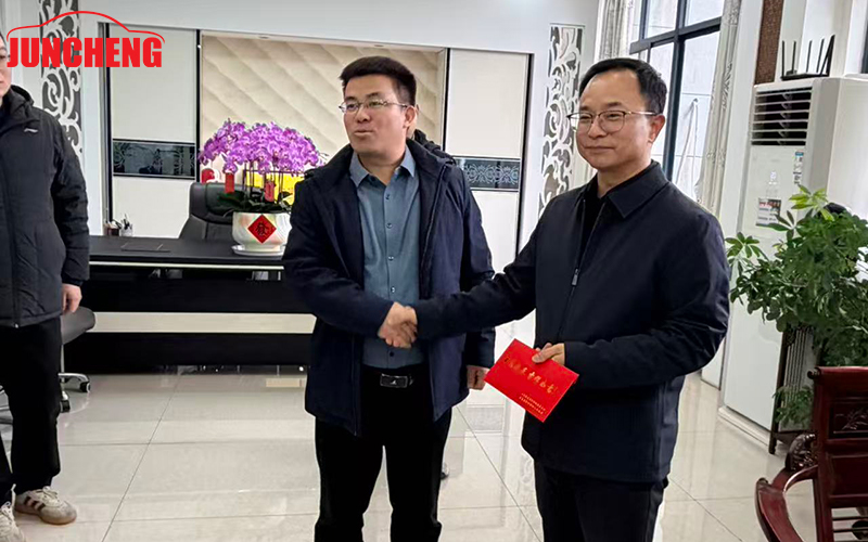 The New Year is approaching, and the rich atmosphere of the festival is intertwined with the pulse of development. On the morning of February 10th, the secretary and his team visited Jiangsu Junchen Vehicle Industry Co., Ltd. to carry out a New Year visit and welfare-giving activity. They sent holiday greetings and New Year blessings to the employees who were on duty, and conducted in-depth research on the enterprise's production and operation, technological innovation, and future development.